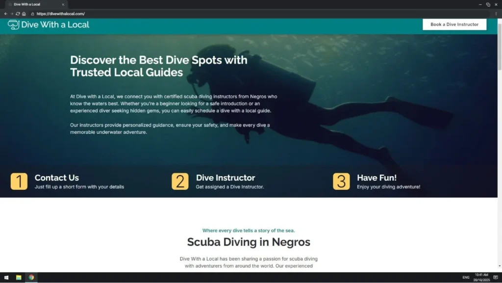 The site effectively captures the excitement of local diving while providing a reliable platform for inquiries and bookings. Regular updates and optimizations keep it secure, fast, and visually engaging—helping Dive With A Local grow its reach among both tourists and diving professionals.